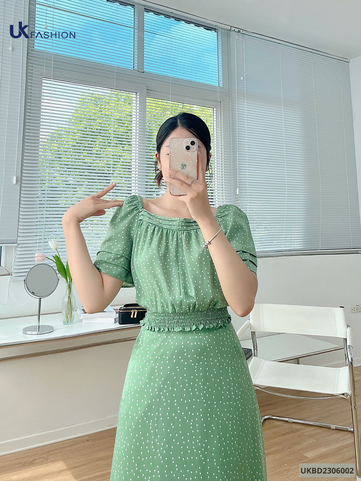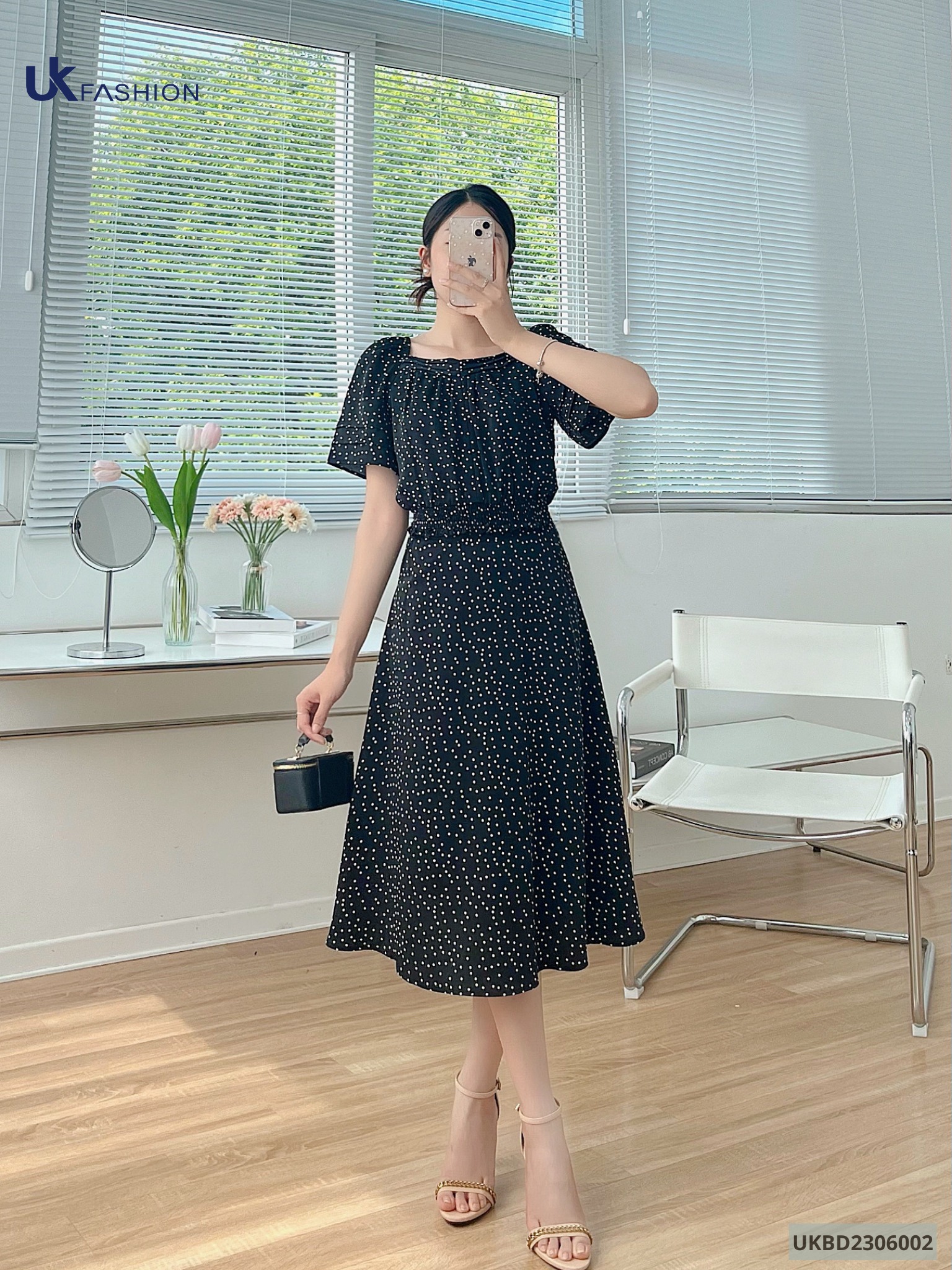 Thiết kế áo sơ mi nhún cùng chân váy dáng xòe nhẹ thanh lịch trên nền họa tiết chấm bi vô cùng xinh đẹp và nữ tính.